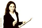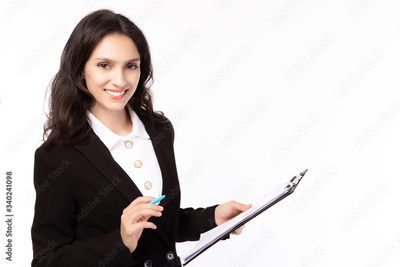 Smiling attractive young caucasian businesswoman with lovely smile. Happy businesswoman wearing suit working on paperwork, hold pen, look at camera. Gorgeous women look confidence and happy with job