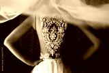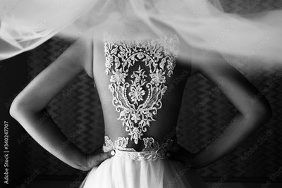the bride stands with her back to the camera. Veil and lace on the back of a girl. Woman holds hands on a belt