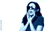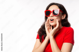 Portrait excited beautiful woman wearing retro casual style, red sunglasses. Surprised young woman look at copy space. She get happy when see product for sale, discount. isolated on white, summer time