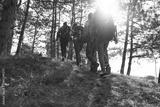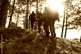 Young people with backpacks walking in the forest