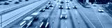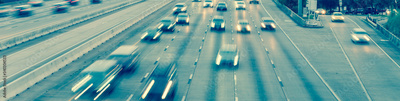 Rush hour traffic on frontage road and Southwest freeway in downtown Houston, USA slow motion