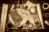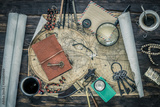 Preparing for travel. Great adventure planning concept. Retro style. Old maps, expedition accessories. Notebook, magnifier, flashlight, compass, tea cup, treasure chest and key on a wooden bench
