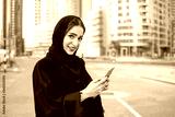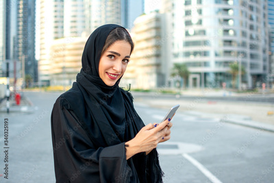 Beautiful smiling young Muslim woman using smartphone on the street.