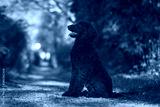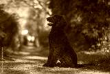 Schwarzer Labradoodle sitzt an einem kleinen Weg