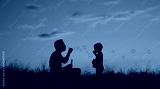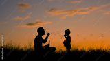 Father son playing in the park blowing bubbles. Family lifestyle concept.