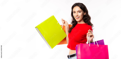 Beautiful shopping woman holding shopping bags with happiness, smiley face. Attractive beautiful Caucasian customer female loves shopping so much. She enjoys buying goods when it is sale or discount