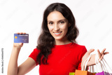 Beautiful woman holding credit card, shopping bags with happy. Attractive beautiful girl buy or shopping goods by using credit card, it is cashless. Credit card is convenient for paying and safety