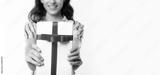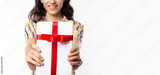 Giving gift box, receive gift box in birthday, new year, valentine, Christmas, special day with happiness, smiley face. Beauty woman get happy when get gift, smile face. isolated on white, copy space