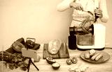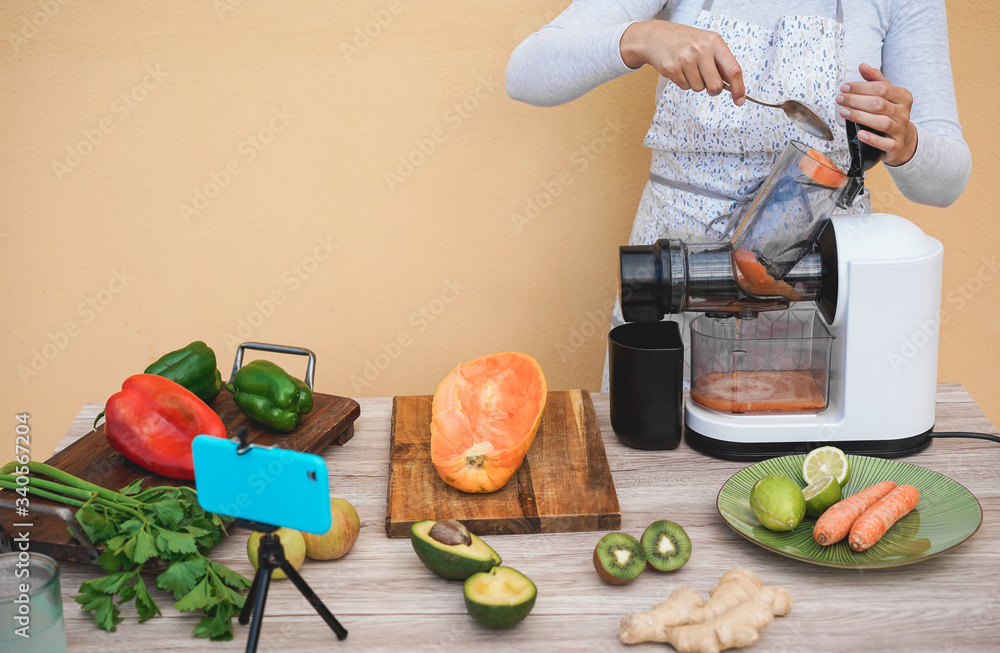 Young woman preparing organic juice with cold pressed extractor machine - Girl making smoothie with vegetables and fruit while making videos during isolation quarantine - Focus on hands