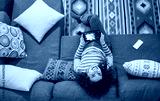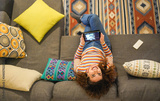 Top view of young happy woman watching videos on tablet at home during isolation quarantine - Tech, stylish and lifestyle trends concept - Focus on female face