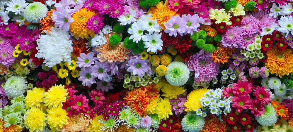 Flowers wall background with amazing red, orange, pink, purple, green and white chrysanthemum flowers, Wedding decoration, hand made Beautiful flower wall background.