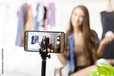 Close up smart phone taking live beautiful young woman Sell online. Vlogging concept.