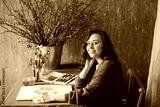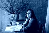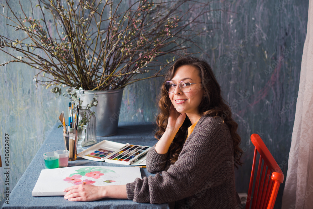 Young artist curly hair in her workplace, watercolor drawing hobby.