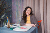 Young artist curly hair in her workplace, watercolor drawing hobby.
