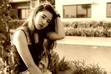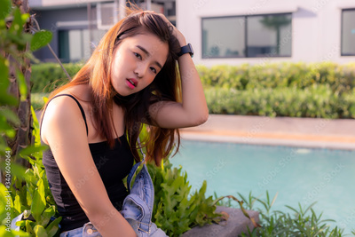 Lonely young asian woman get boring when stay at apartment alone. Pretty girl sit near swimming pool. She get quarantine, she came back from oversea. Teenager miss parents. Attractive female get sad