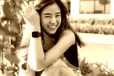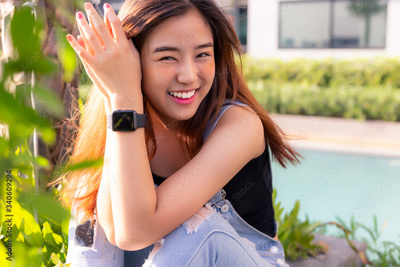 Portrait charming beautiful woman. Attractive beautiful girl gets happy and relaxing with smiley face. Gorgeous female get enjoying life in summer season. Pretty woman wears denim overalls fashion