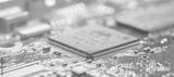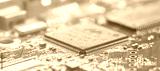 Microchip and printed circuit board in soft focus. The photo toned blue.