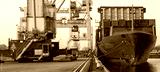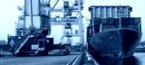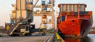 port quay at container terminal. In the background a ship with containers and a gantry crane