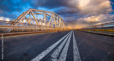 old road bridge next to the truss rail bridge during a dramatic evening storm