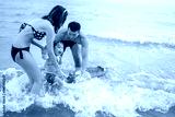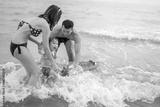 Happy family lifestyle concept.Young mother with kids surfing position and splashing with fun in breaking waves.Summer travel, water sport outdoor activities,swimming lessons on tropical beach holiday