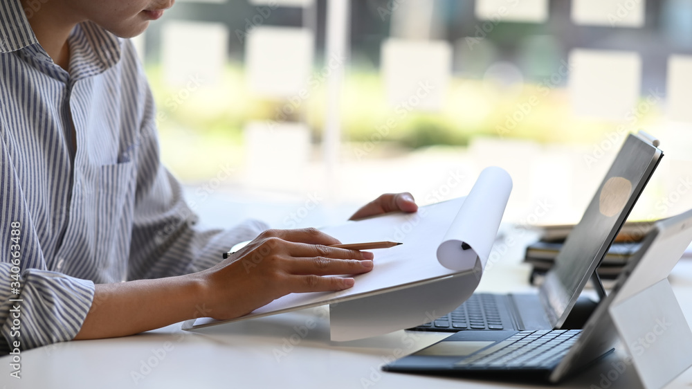 Cropped image of smart man working as architect while planning/drawing on clipboard and sitting at the white working desk with two of computer tablet with keyboard case over glass wall as background.