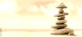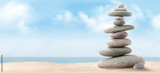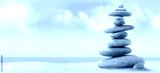 Pyramid of sea pebbles on a sunny sand beach