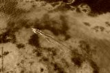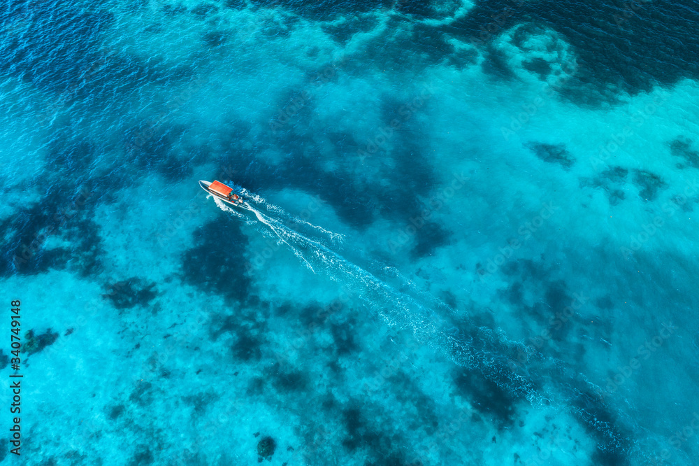 Aerial view of the fishing boat in clear blue water at sunset in summer. Top view from drone of yacht, sandy beach in Indian ocean. Travel in Zanzibar, Africa. Tropical landscape with motorboat, sea
