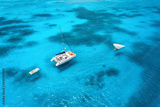 Aerial view of the yacht and sailboat in clear blue sea at sunset in summer. Top view of fishing boat, yachts, sandy beach, transparent water in Zanzibar. Travel. Tropical seascape. View from above