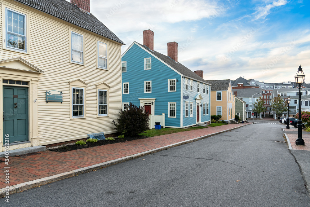 Street lined with traditional pastel coloured New England detached houses at sunset. Portsmouth, NH, USA.