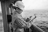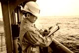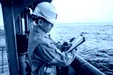 Filipino deck Officer on deck of offshore vessel or ship , wearing PPE personal protective equipment. He fills checklist. Paperwork at sea