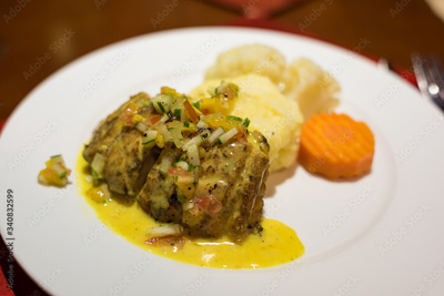Rice with vegetables and fish meal. White steamed rice served with fish curry