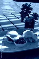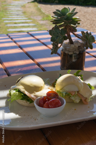 Eggs benedict with hollandaise sauce and salmon served with cherry tomatoes