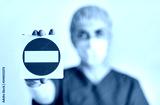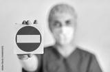 health, medicine and pandemic concept - young female doctor or nurse wearing face protective mask for protection from virus disease and hat showing stop sign over grey background
