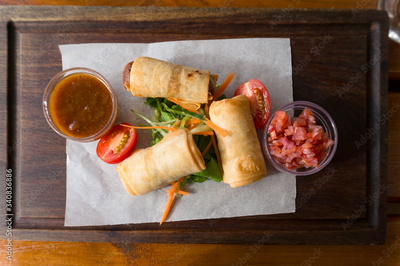 Spring rolls with spicy sauces. Deep fried spring rolls meal