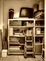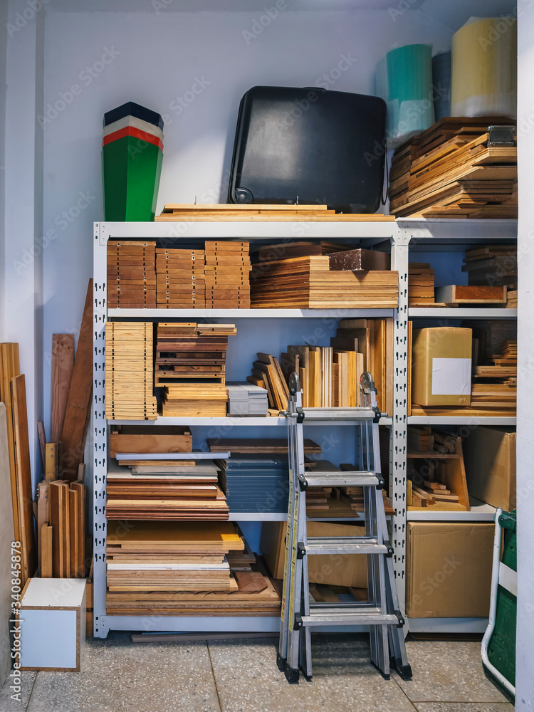 Shelf storage wooden frame with stairs Warehouse stock Carpenter room