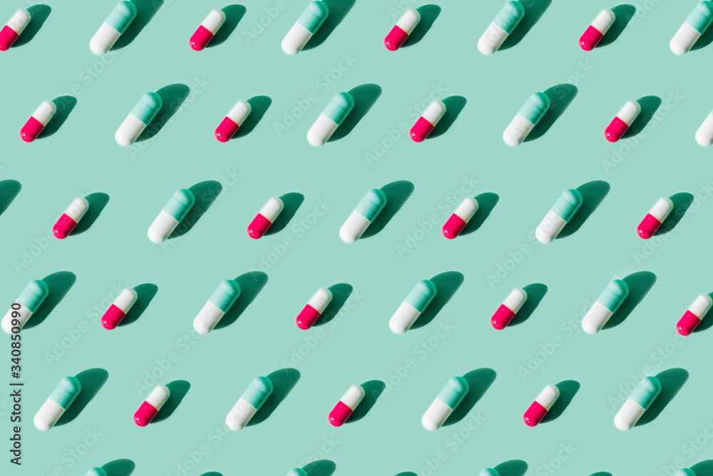 Pattern made with medicine pills on bright pastel light blue background. Medicine and pharmacy creative concepts. Trendy colors.