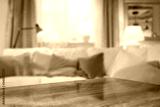 Desk of free space and blurred home interior