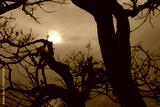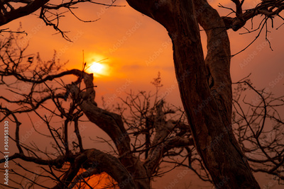 Beautiful silhouette leafless tree and sunset sky. Romantic and peaceful scene of sun, and golden sky at sunset time with beauty pattern of branches. Beauty in nature. Sunset view wallpaper background