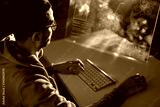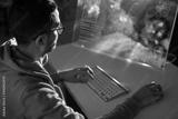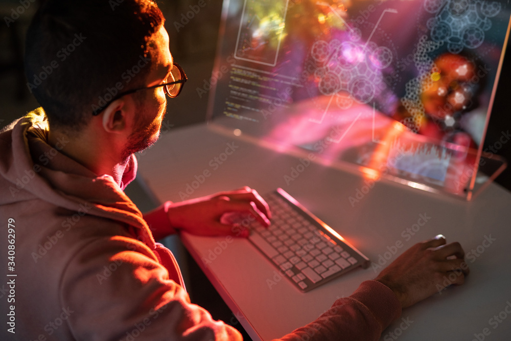 Over shoulder view of young engineer in glasses sitting at table and designing 3D model on computer