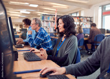 Group Of Mature Adult Students In Class Working At Computers In College Library