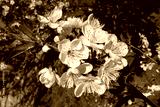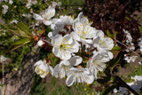 A branch with white flowers and young leaves of a blossoming cherry tree in spring in the garden.
