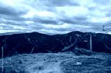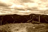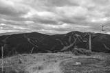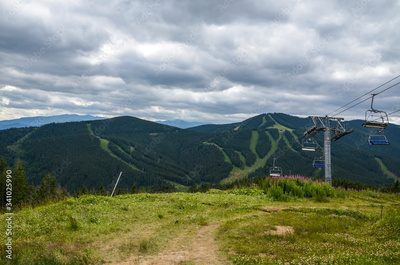Cable car in the ski resort Bukovel and Carpathian Mountains landscape. Green forests, hills, grassy meadows and blue sky. Summer holidays in the mountains.