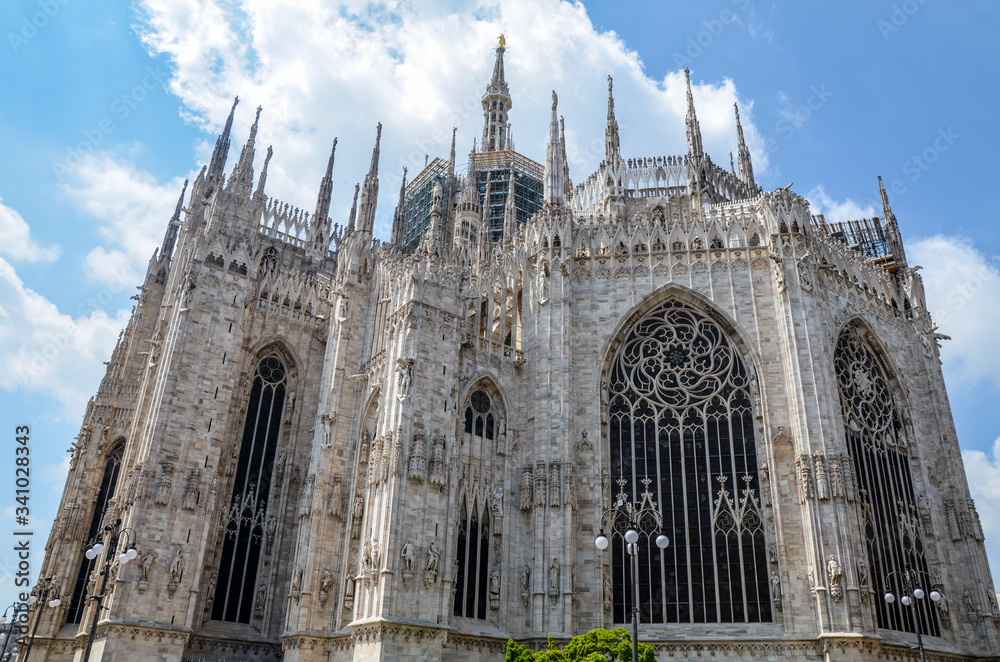 Side view of the Duomo with white walls, high windows, spires, and mouldings, the catholic gothic medieval Cathedral in Milan historical city centre, Lombardy, Italy