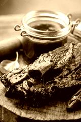 Delicious BBQ baby-back ribs with tangy sauce and a basting brush on wooden cutting board