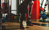 Training a young athlete with a kettlebell in front of a mirror in the gym.