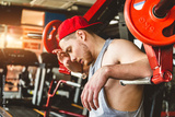 Muscular young male athlete is resting between exercises and wipes sweat from his forehead. Strength training in the gym on the simulator