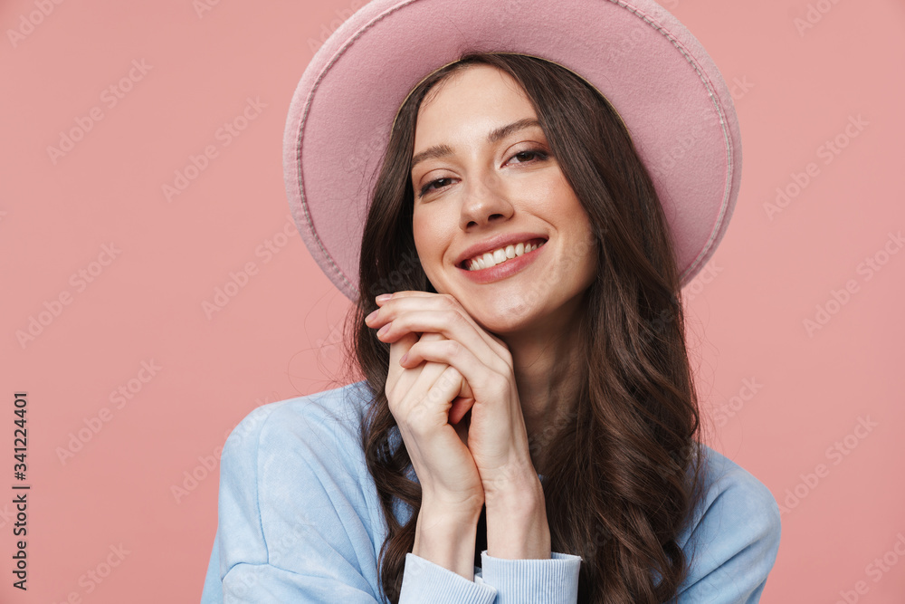 Image of young woman with long brown hair wearing hat smiling at camera