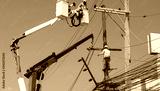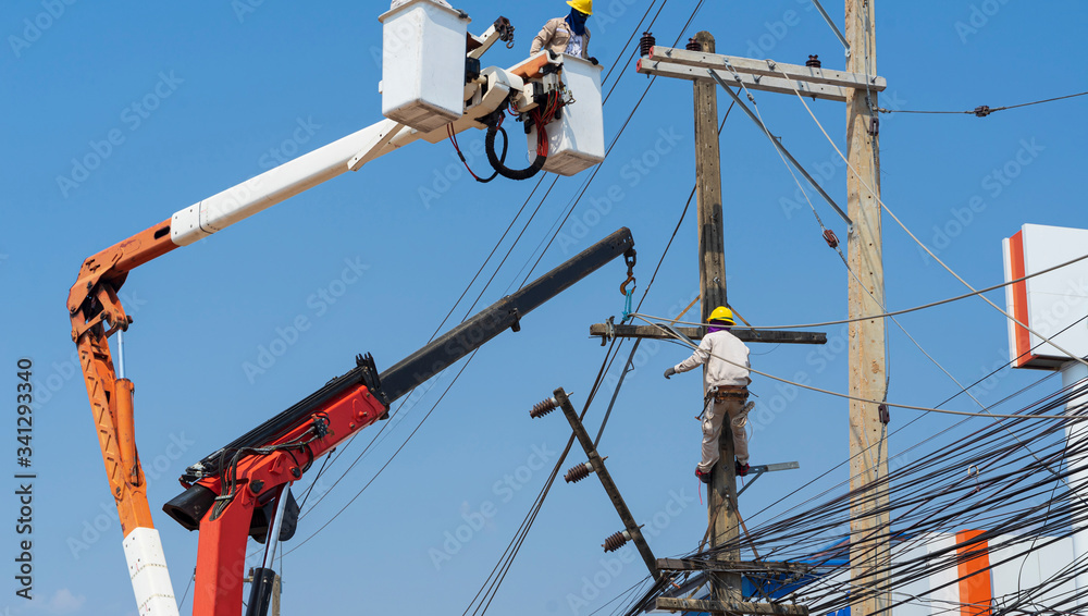 Electricians install equipment in the high-voltage system.