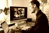 Young man having Zoom video call via a computer in the home office. Stay at home and work from home concept during. Man making notes during virtual video chat conference call telecommute