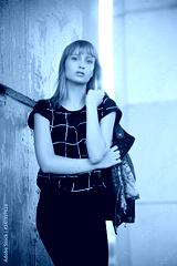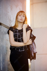 One blonde girl is standing near a concrete wall in the hands of a jacket. Spring day black jacket black jeans